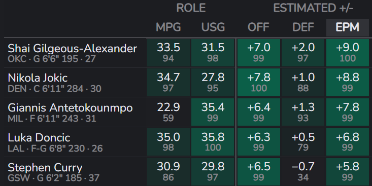 高阶数据更不用多说,本赛季的约基奇在之前的基础上,再创历史新高,亚历山大想要追上约基奇难度不小——除了EPM,目前亚历山大已经以+9.0超过约基奇+8.8,他在进攻端的贡献没有约基奇凶残,但是防守端贡献更好。
