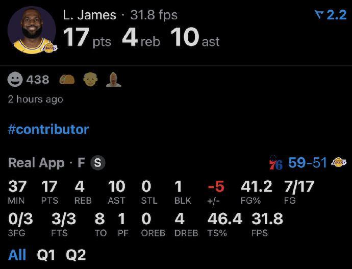 所幸,末节决战阶段詹姆斯爆发,他单节8中5得到10分,持续冲击内线率领湖人反扑追分,从而最终惊险逆转战胜76人取胜。